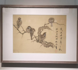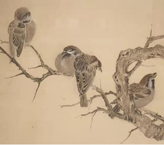 作品简介:图绘枯木及九只麻雀飞动或栖止其间的情景,九只小雀依飞鸣动静之态散落树间,自然形成三组。该图构图巧妙,布局得当,在动与静之间既有分割又有联系。作者以干湿兼用的墨色、松动灵活的笔法绘麻雀及树干。麻雀用笔干细,敷色清淡。树木枝干多用干墨皴擦晕染而成,无刻划痕迹,明显区别于黄筌画派花鸟画的创作技法。
