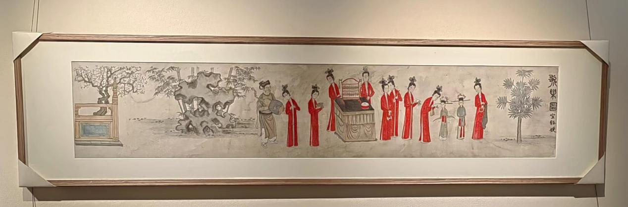 作品简介:作品以工笔重彩为主,兼以淡彩写意,绢本设色,描绘戏曲杂剧歌舞场景。中绘九位女乐伎,两位舞者,一位老乐师。女乐伎服饰一致,身着红色褙子,头饰珠宝,衣着华丽,各执不同乐器。女舞者头顶花冠,身形较矮小。画面左端绘梨树兼栏板,点明梨园,有湖石间以竹点缀,右端有树一棵,与画左端树石两相呼应,环绕人物,整体组成南宋乐舞日常一片段。