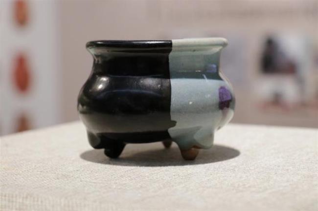 作品简介:鬲式炉,直口,斜折沿,直颈,扁圆腹,底周装三足。施青釉,足底无釉,呈黄灰胎色。原器物口沿缺失,以原子灰为基础补齐造型,再以黑漆装饰。