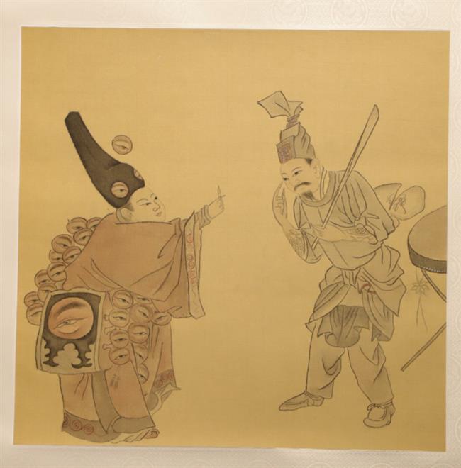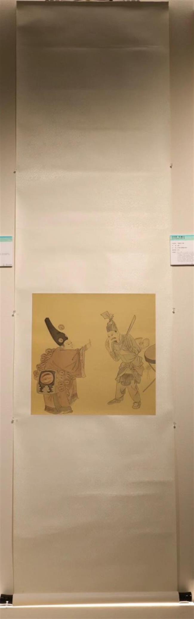 作品简介:图中一人腰插一扇,中间开裂,上书一字似“渥”,可能是插科打译、故意装傻的意思。此人臂肘间有“点青”,右手指眼睛,左手握一板。另一人衣冠绘满眼睛图案,一手捏着眼膏瓶,显然是在推销眼药。画幅右侧有一大鼓,仅见小半。口此图虽然绘制的是戏剧场景,但人物的动作神态表现得非常到位,体现了画家对当时市井生活的关注。另外,人物的服饰、装扮对于研究宋代文化具有一定的参考价值。装裱形式为传统一色裱,但细看天地头与上下隔水的花色却不同,天真质朴、雅致清新。