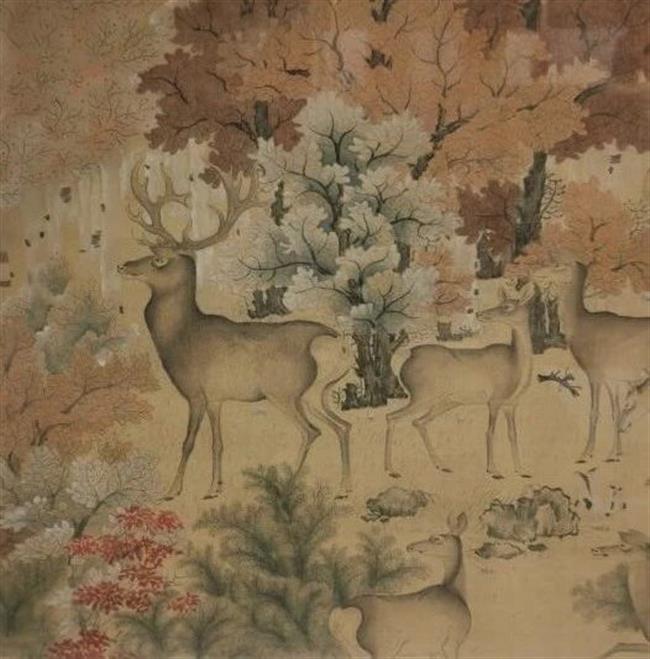 作品简介:作品为五代时佚名画家创作的一幅绢本重彩绘画作品,描绘的是群鹿游憩于色彩斑斓的秋林中的情景,造型生动真实,颇具情趣。构图繁密饱满,形式美感强烈。作者使用传统的皴法、勾勒之法较少,却大幅度使用了类似西方的光影之法来表现鹿的立体感,且敷色富丽鲜艳又有别于常见的没骨山水。