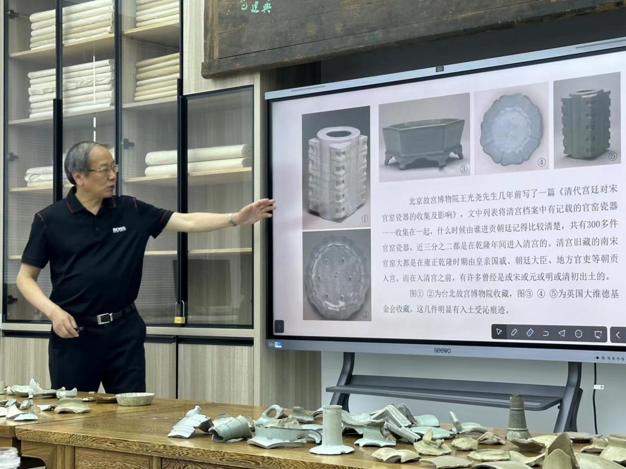 华雨农以早期南宋官窑瓷器为切入点,向大家介绍了南宋官窑的发展历史,让大家对南宋官窑在不同时期的烧成状态有所了解,并指出当前环境下一些对南宋官窑的错误认知。在梳理基础知识后,华雨农向大家讲解南宋官窑瓷器在各大拍卖会中的拍卖行情。最后,华雨农以图文演示的方式,结合现场展示的南宋官窑瓷片,向同学们介绍了南宋官窑瓷器的鉴定要点,系统阐述了南宋官窑的特征。