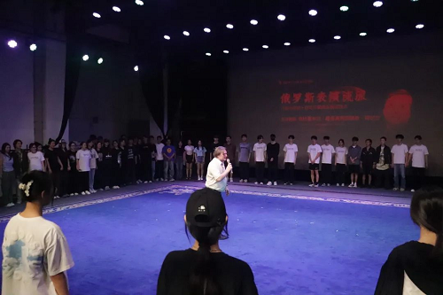 演教学院表演艺术专业全体学生、教学团队及其他相关专业的部分同学参加了工作坊的学习与训练。授课前举行了简短的欢迎仪式,部分同学为弗拉基米尔教授展示了三个小节目。随后弗拉基米尔教授展开了关于“行动分析法”的运行逻辑以及实践运用时注意力的重要性,并现场带领着一百多位同学进行了“行动分析法”的训练,通过节奏、行动、空间、任务的不断变化,让同学们在训练中更加清晰地感受到注意力是演员的基石,关注场上发生的一切,强调训练行动的逻辑及准确的表达。