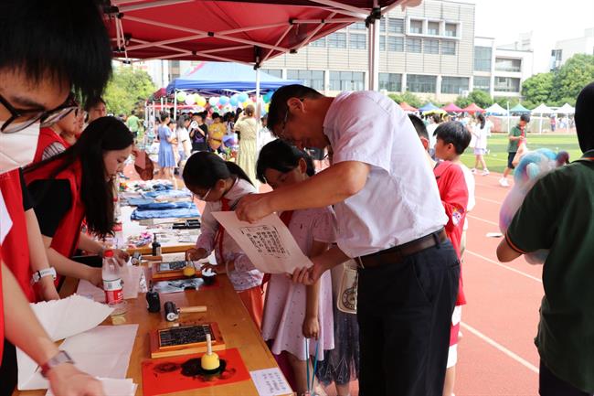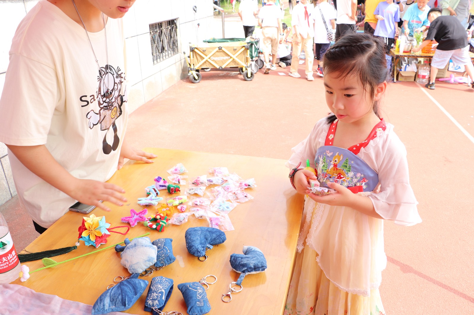 感受完古色古香的活字印刷,这还有一个蓝白艺术交织的扎染小摊。以扎染的手法制作出的包包和雅致的耳环与方巾,惟妙惟肖的小玩偶等等,无不散发着独具匠心的美感。艺小匠们将自己亲手制作的精美文创小商品整齐摆开,路过的老师和孩子们纷纷停下脚步来到摊位上选购物品。