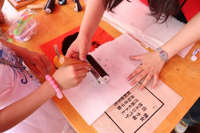 艺小匠们引导小朋友们用刷子和滚轮蘸取墨汁,将字模和边框上墨。