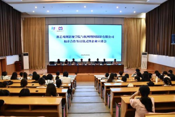 为加强学院与行业企业间的合作联系,构建“共建共享、优势互补、互利共赢”的产教融合新局面,6月5日 ,戏剧影视学院与杭州缦图摄影有限公司(以下简称“缦图摄影”)校企合作签约仪式暨企业宣讲会在图信中心报告厅顺利举行。缦图摄影招聘总经理子卓、校企合作经理书生,戏剧影视学院党总支书记彭云波、常务副院长郑怡文、专职副书记许瑛、院长助理徐旭恒及相关教师出席签约仪式。仪式由许瑛主持。