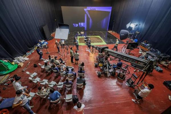 在长春电影制片厂摄影棚,工作人员向大家展示了虚拟制片VP产教融合案例。该项目由电影学院的师生与企业共同合作完成,集产学研于一体,应用新技术新理念打造影视制作教学场景。在现场,我院参会老师与工作人员探讨虚拟制片技术在教学上的实际应用及发展趋势。