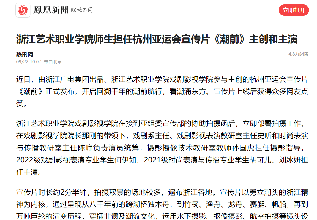 何伊如说:“这是我自担任亚运会采火使者后第二次参与亚运、服务亚运,我感到十分荣幸。在拍摄过程中,我真切感受到浙江文化的魅力。站在德寿宫门前,我透过那一抹红墙看见了千百年前临安的盛世风貌、南宋的繁华典雅;泛舟西湖之上,游船摇摆开一圈圈涟漪,看水绿得清澈,绿得透亮;漫步苏堤、白堤,循着历史的足迹,感受自然的美丽。这让我不禁感叹杭州之美与浙江文化的源远流长。”