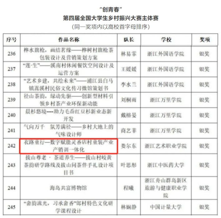 11月22日,“创青春”第四届全国大学生乡村振兴大赛落下帷幕,经过激烈角逐,我校《衣路童行-数字赋能灵香店村童装产业产销训一体化》项目在93所高校、3839支队伍、近3万名师生中脱颖而出,斩获银奖。同时该项目在“建行裕农通杯”第七届浙江省大学生乡村振兴创意大赛获得金奖,实现我校在该赛事上金奖零的突破。