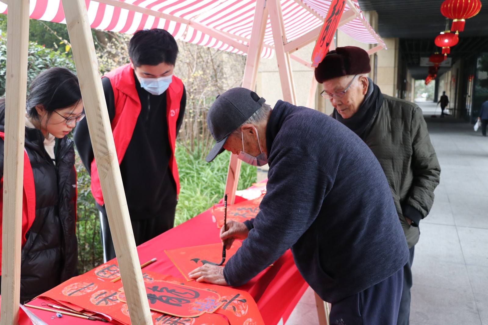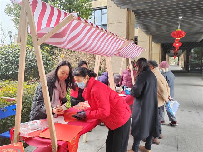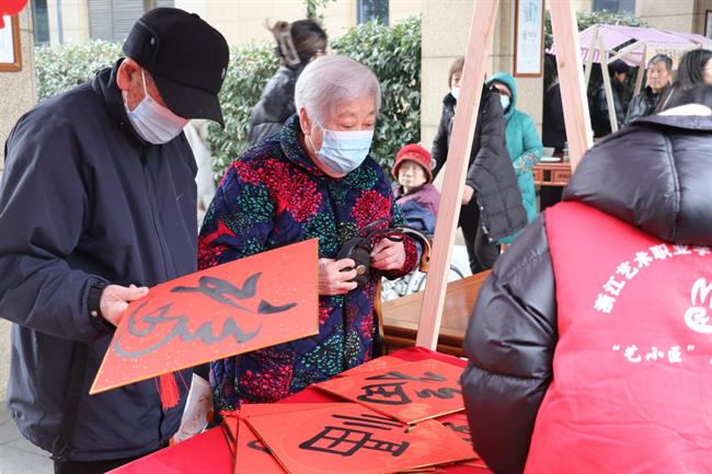 在水印木刻体验摊位前,一位长者正认真印制着自己的作品,每个动作都透露出对传统文化的欣赏和敬意;扎染作品摊位上,一块块布料迎风飘扬,绽放出独特的风采;瓷器作品摊位内,精美的杯、盏、碗引得老人们驻足欣赏;在手写福字摊位前,人潮涌动、福字飘香,一笔一划都带着新年的祝福和希望。