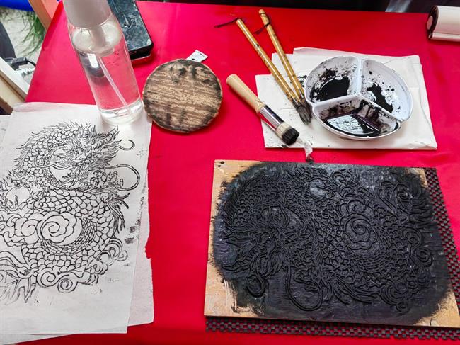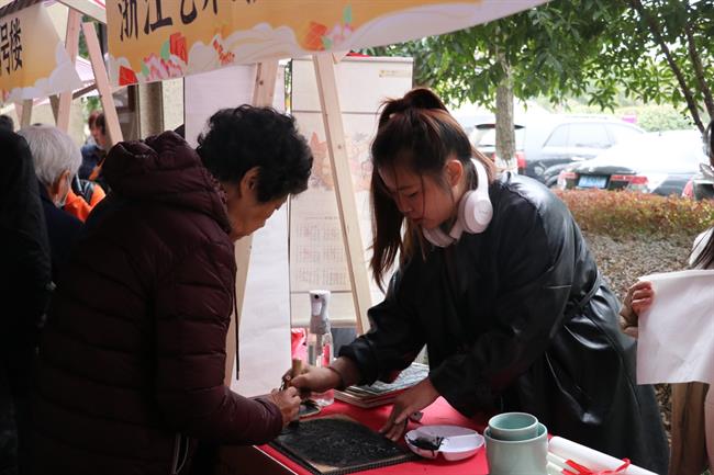 市集上,各式各样的摊位琳琅满目,各色各类商品也是令人目不暇接。手工艺学子们带来了水印木刻、印染工艺作品、瓷器作品以及春联、手写福字体验等项目,让非遗文化和活态体验直接面向老年群体。这不仅为老年人提供了更多的文化服务和艺术体验,更是引导学生们以非遗技艺服务养老产业的一次生动社会实践。
