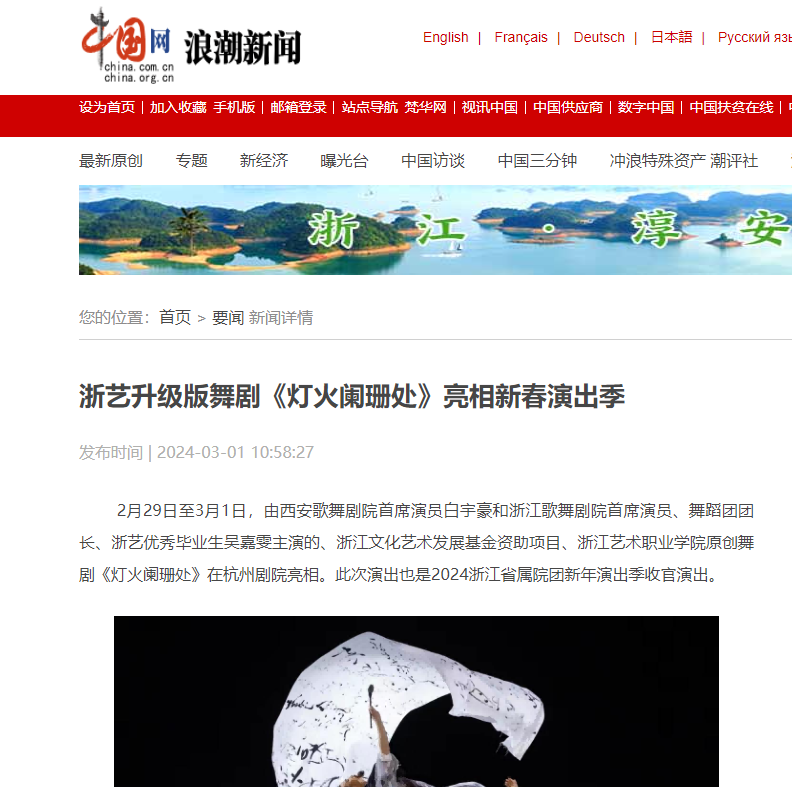 中国网浪潮新闻:浙艺升级版舞剧《灯火阑珊处》亮相新春演出季