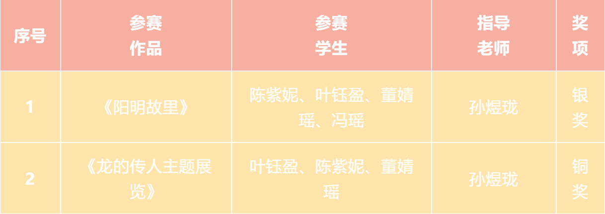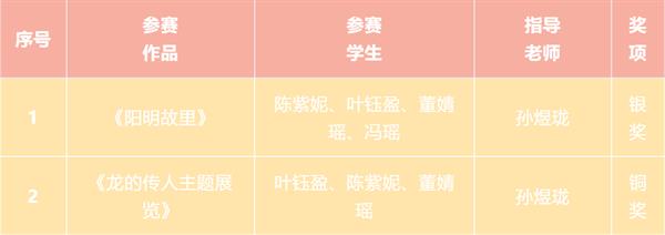近日,由海峡两岸交流促进会、台湾旅游和文化协会牵头,台湾国际文化创意产业发展协会、高教创赛云竞赛服务平台及两岸文创单位和多所大学协办的2023首届两岸数字艺术设计·年度奖获奖结果公布。本届赛事共征集到来自全国各地的命题赛道“龙的传人”及非命题赛道共计41531项参赛作品,参赛总人数达8.7万人,参赛院校及单位共1521所。设计学院动漫设计专业专业带头人孙煜珑指导的2022级动漫设计专业陈紫妮、叶钰盈、董婧瑶、冯瑶同学的作品《阳明故里》荣获银奖,叶钰盈、陈紫妮、董婧瑶同学的作品《龙的传人主题展览》荣获铜奖。