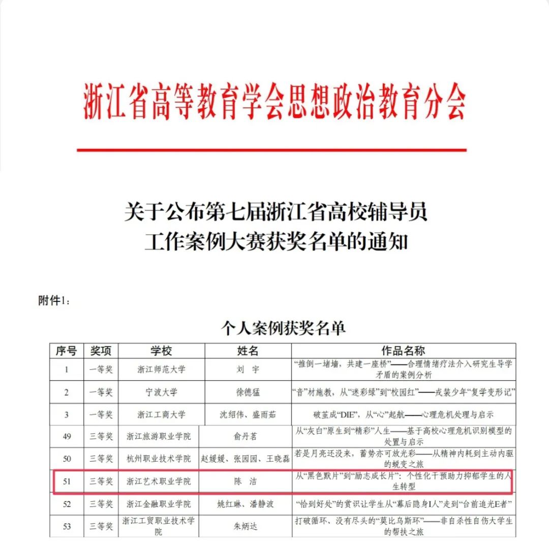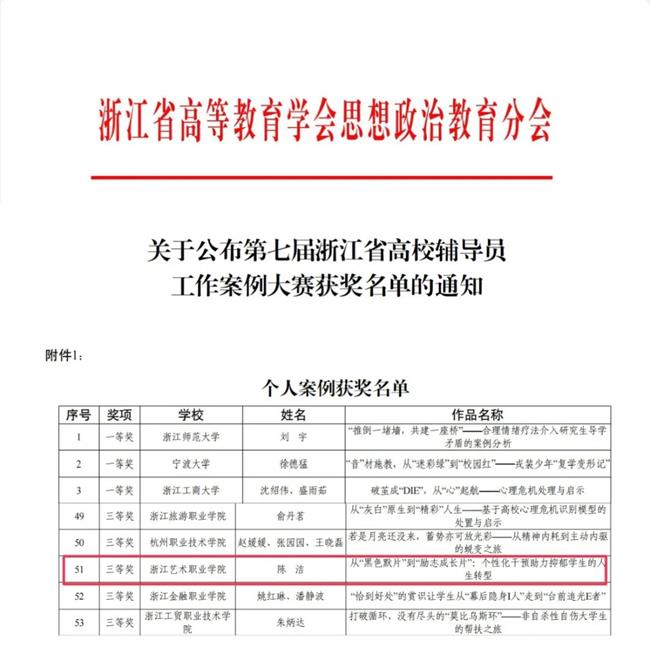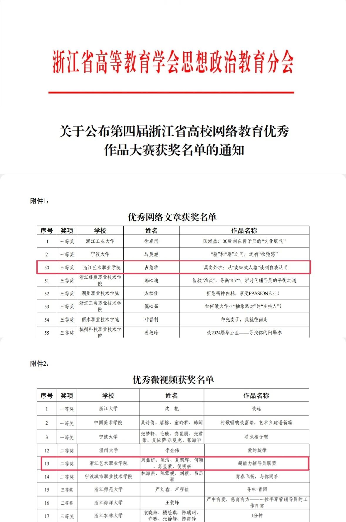 近日,浙江省教育厅宣传教育与统战处、浙江省高等教育学会思想政治研究分会公布第四届浙江省高校网络教育优秀作品大赛和第七届浙江省高校辅导员工作案例大赛获奖名单,我校辅导员获得二等奖1项,三等奖2项的好成绩。