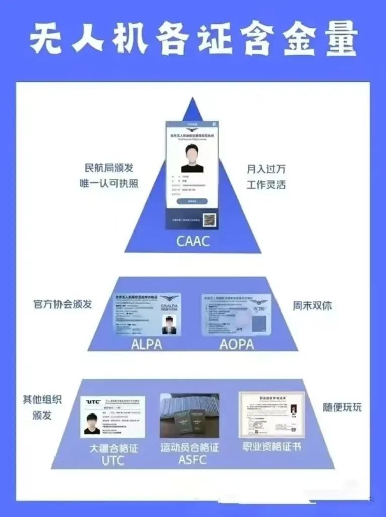 民用无人机操控员执照是由中国民航局(CAAC)飞行标准司直接颁发和管理的执照,是唯一由民航局直接颁发的无人机执照,具有权威的法律效力,是全国通用的驾驶无人机的必要证件(类似于汽车驾照)。